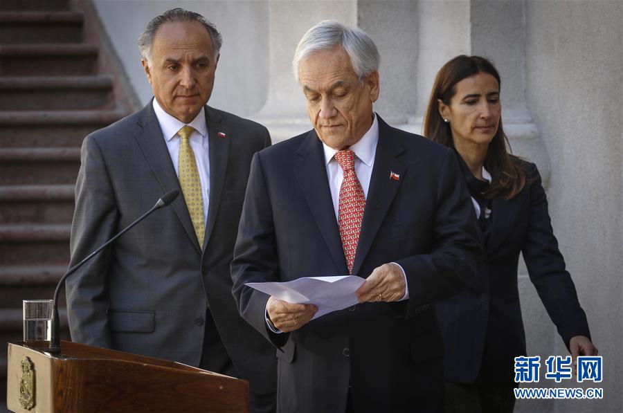 10月30日,在智利首都圣地亚哥,智利总统皮涅拉(中)准备发表讲话。 智利总统皮涅拉30日上午在总统府发表电视讲话,宣布智利政府放弃主办原定分别于今年11月和12月举行的亚太经合组织(APEC)领导人非正式会议和联合国气候变化大会,优先应对国内局势。 新华社/智利一号通讯社