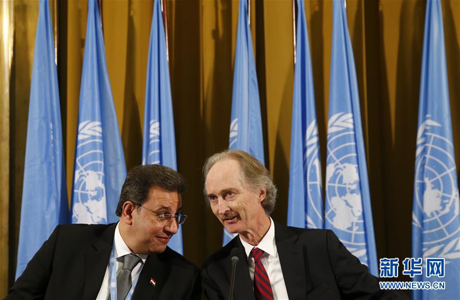 10月30日,在瑞士日内瓦,联合国秘书长叙利亚问题特使彼得森(右)和叙宪法委员会中代表政府的联席主席艾哈迈德·库兹巴里在启动仪式上交谈。 由叙利亚政府、反对派和民间人士代表组成的叙利亚宪法委员会30日在日内瓦正式启动,开始就宪法改革事宜展开工作。 新华社发(丹尼斯·巴利布斯摄)