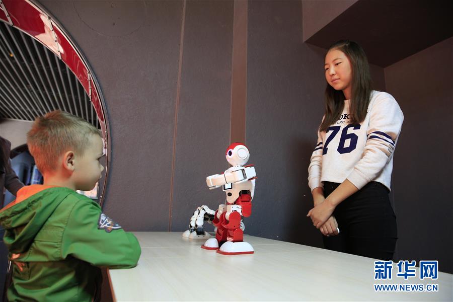 10月29日,在吉尔吉斯斯坦首都比什凯克,一名小男孩观看互动展上的机器人。 当日,吉尔吉斯斯坦首都比什凯克举行“机器人世界2.0”互动展,许多功能和形态各异的机器人亮相其中。 新华社发(罗曼摄)