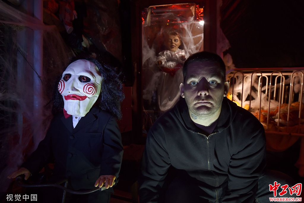 当地时间2019年10月29日,法国勒芒,万圣节在即,恐怖电影爱好者Cedric Le Coz将自己家改造成“鬼屋”,并对公众开放。图片作者:JEAN-FRANCOIS MONIER /视觉中国