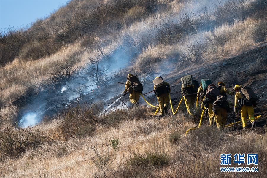 10月30日,在美国加利福尼亚州锡米瓦利,消防员们参与灭火行动。 近日,美国加利福尼亚州山火持续肆虐,大量居民被迫撤离。 新华社发(钱卫忠摄)
