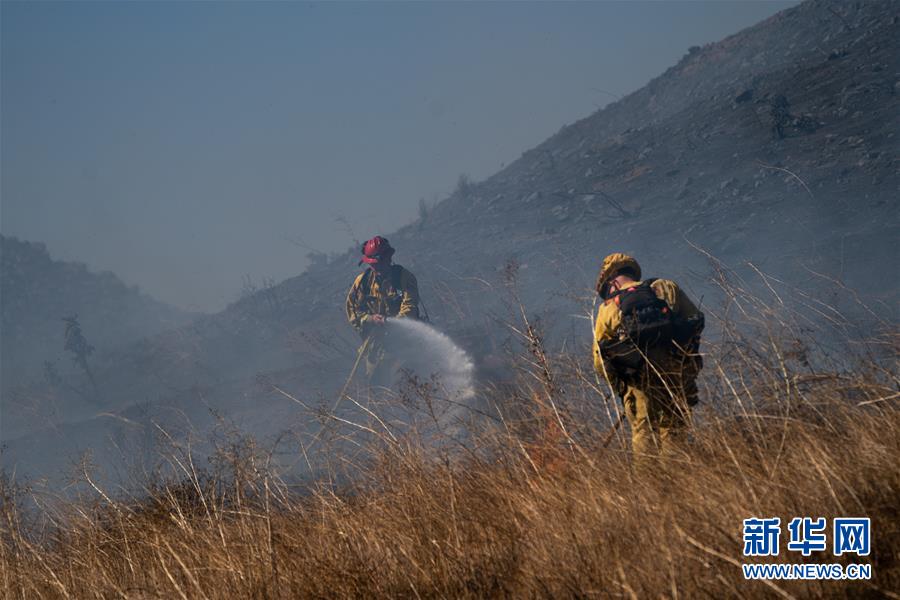 10月30日,在美国加利福尼亚州锡米瓦利,消防员们参与灭火行动。 近日,美国加利福尼亚州山火持续肆虐,大量居民被迫撤离。 新华社发(钱卫忠摄)