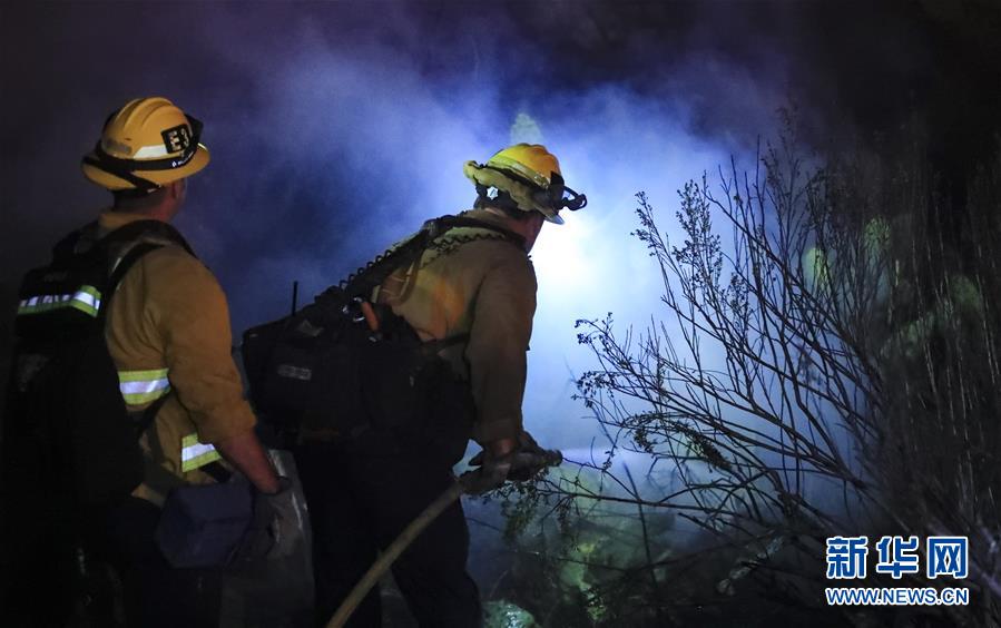 10月30日,在美国加利福尼亚州富勒顿市,消防员在火场工作。 近日,美国加利福尼亚州山火持续肆虐,大量居民被迫撤离。 新华社记者 李颖 摄