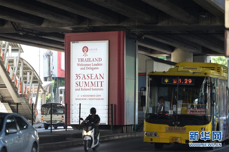 10月30日,在泰国曼谷,车辆驶过东盟峰会宣传海报。 第35届东盟峰会及东亚合作领导人系列会议将于11月2日在泰国首都曼谷开幕。 新华社发(拉亨摄)