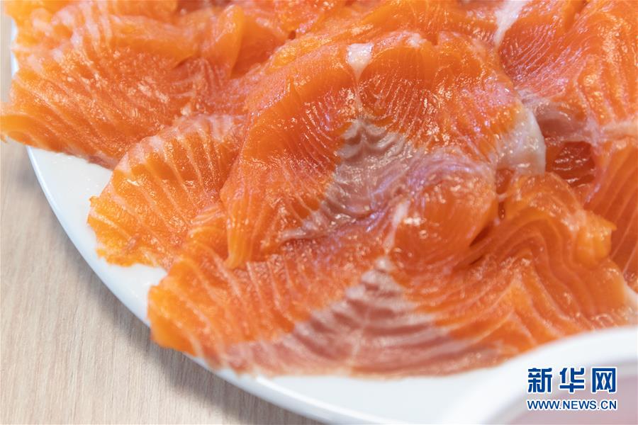 这是9月13日在俄罗斯摩尔曼斯克以北的巴伦支海域的鲑鱼养殖场拍摄的鲑鱼肉片。 俄罗斯水产养殖公司是俄罗斯大西洋鲑和虹鳟的主要生产商之一。目前,该公司产品在俄市场上占比近20%,在摩尔曼斯克和卡累利阿共和国均有养殖场。俄罗斯水产养殖公司总经理伊利亚·索斯诺夫认为,中国鲑鱼消费市场潜力巨大。“中国市场对于我们来说非常重要,我们期待早日进入中国市场……希望我们的鲑鱼能赢得中国消费者的喜爱。” 新华社记者白雪骐摄