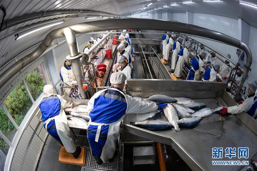 9月13日,在俄罗斯摩尔曼斯克,俄罗斯水产养殖公司工作人员在车间处理鲑鱼。 俄罗斯水产养殖公司是俄罗斯大西洋鲑和虹鳟的主要生产商之一。目前,该公司产品在俄市场上占比近20%,在摩尔曼斯克和卡累利阿共和国均有养殖场。俄罗斯水产养殖公司总经理伊利亚·索斯诺夫认为,中国鲑鱼消费市场潜力巨大。“中国市场对于我们来说非常重要,我们期待早日进入中国市场……希望我们的鲑鱼能赢得中国消费者的喜爱。” 新华社记者白雪骐摄
