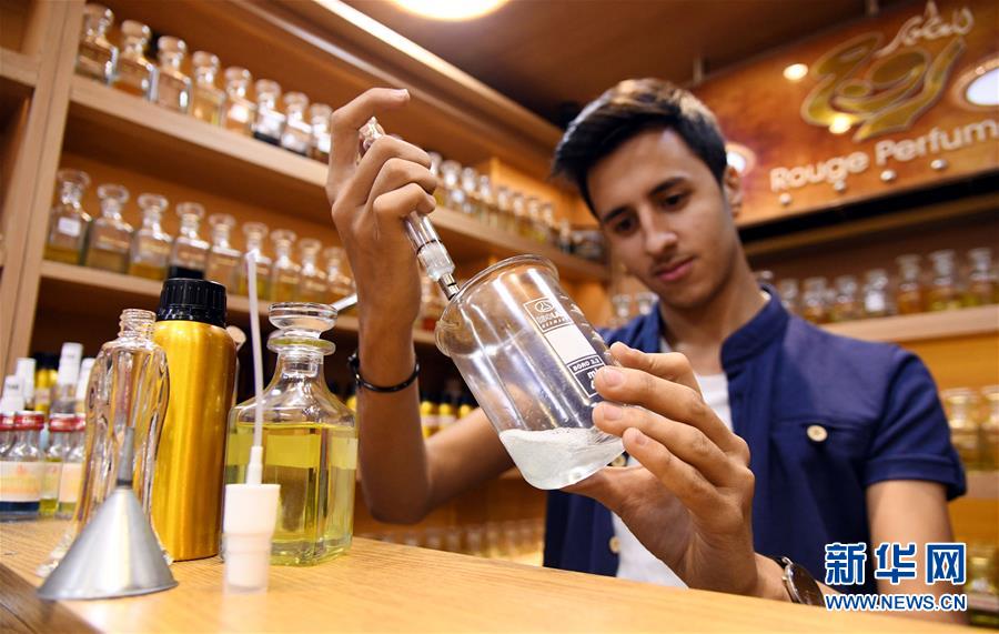 10月6日,在叙利亚大马士革,阿纳斯·阿巴斯调配香水。 新华社发(阿马尔·萨法尔贾拉尼摄)