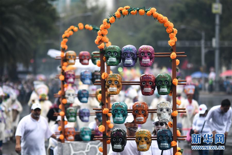这是11月2日在墨西哥首都墨西哥城亡灵节游行上拍摄的面具。新华社记者 辛悦卫 摄