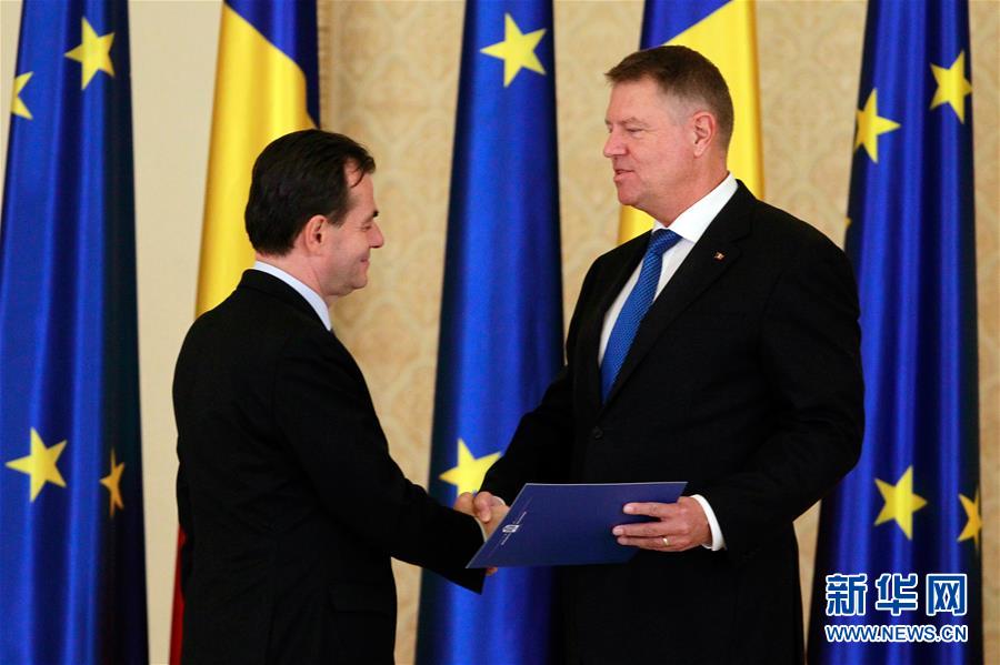 11月4日,在罗马尼亚首都布加勒斯特,新总理奥尔班(左)宣誓后与总统约翰尼斯握手。 新华社发(克里斯泰尔摄)