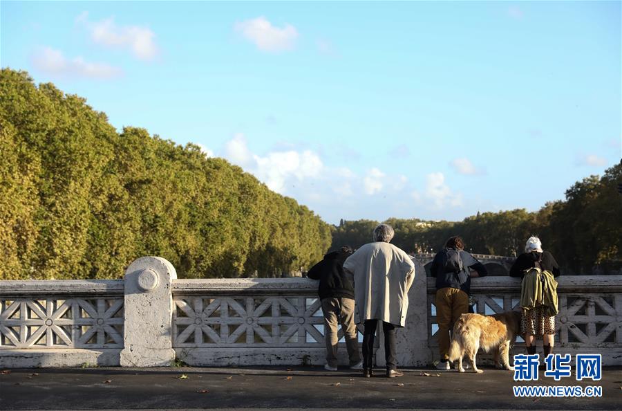 11月4日,在意大利首都罗马,人们站在桥上欣赏台伯河畔美景。 连日阴雨后,罗马迎来了好天气,人们纷纷来到户外享受秋日的阳光与美景。 新华社记者程婷婷摄