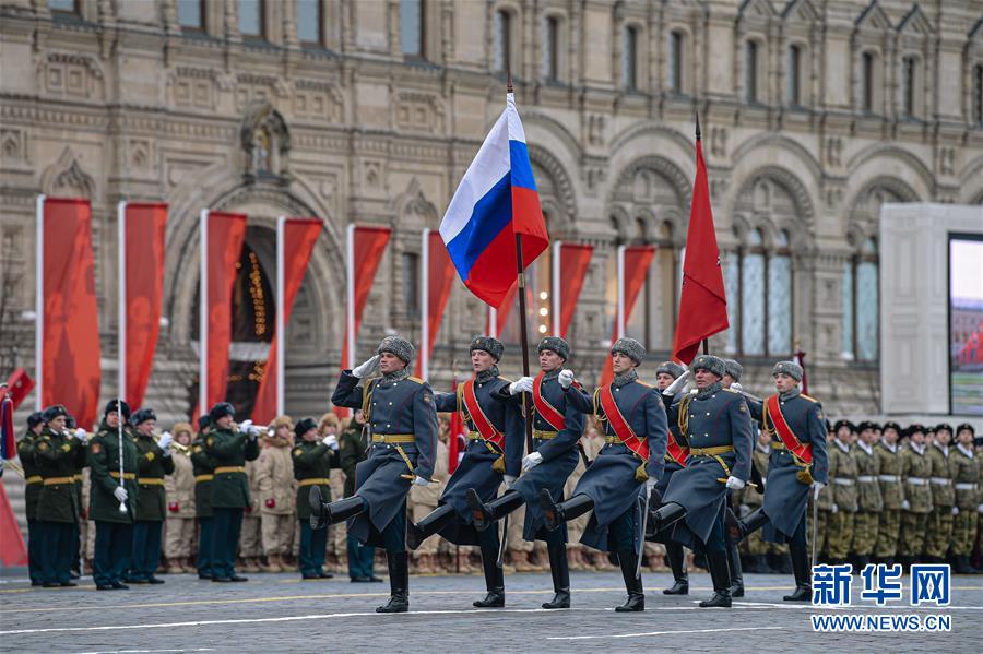 11月7日,士兵在俄罗斯莫斯科红场参加纪念1941年红场阅兵78周年阅兵。新华社发(西尼岑 摄)