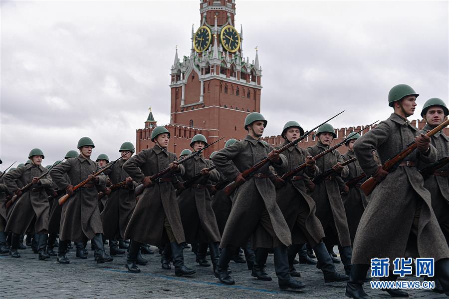 11月7日,士兵在俄罗斯莫斯科红场参加纪念1941年红场阅兵78周年阅兵。新华社发(西尼岑 摄)