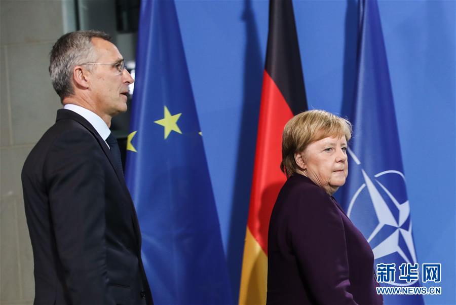 11月7日,在德国首都柏林的总理府,德国总理默克尔(右)与来访的北约秘书长斯托尔滕贝格抵达新闻发布会现场。新华社记者 单宇琦 摄