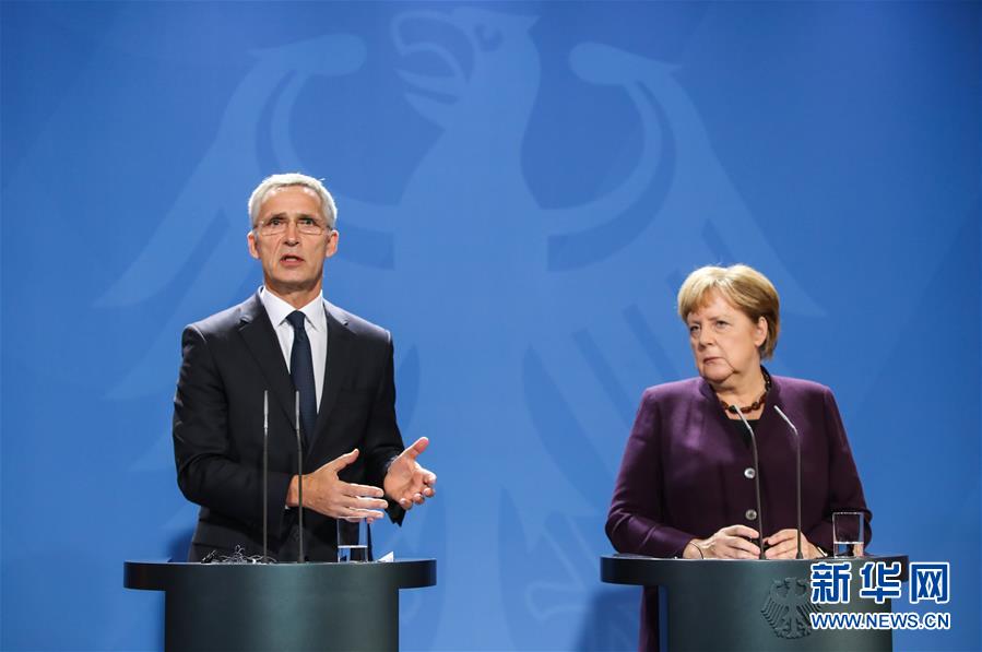 11月7日,在德国首都柏林的总理府,德国总理默克尔(右)与来访的北约秘书长斯托尔滕贝格出席新闻发布会。新华社记者 单宇琦 摄