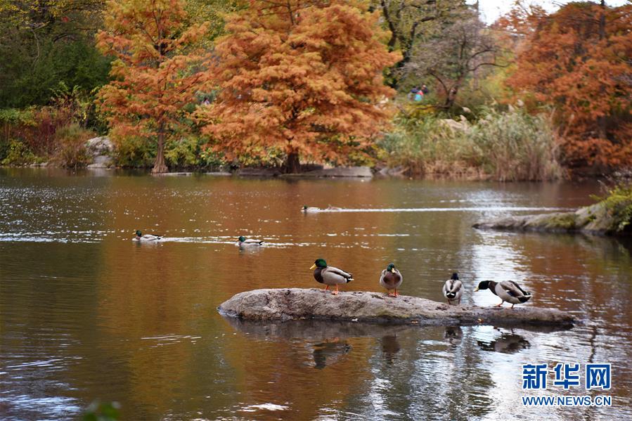 11月8日,野鸭在美国纽约中央公园池塘中休憩。 11月上旬,随着气温骤降,纽约公园、街头等处树木变黄转红,整个城市沉浸在浓浓秋意之中。 新华社记者 韩芳 摄