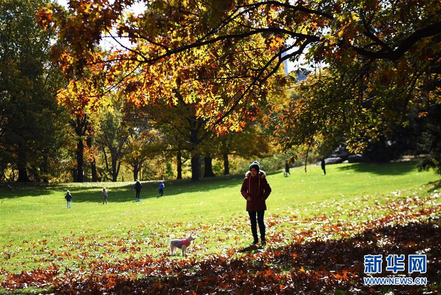 11月8日,游客漫步美国纽约中央公园。 11月上旬,随着气温骤降,纽约公园、街头等处树木变黄转红,整个城市沉浸在浓浓秋意之中。 新华社记者 韩芳 摄
