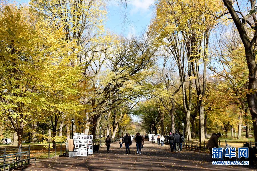 11月8日,游客漫步美国纽约中央公园。 11月上旬,随着气温骤降,纽约公园、街头等处树木变黄转红,整个城市沉浸在浓浓秋意之中。 新华社记者 韩芳 摄