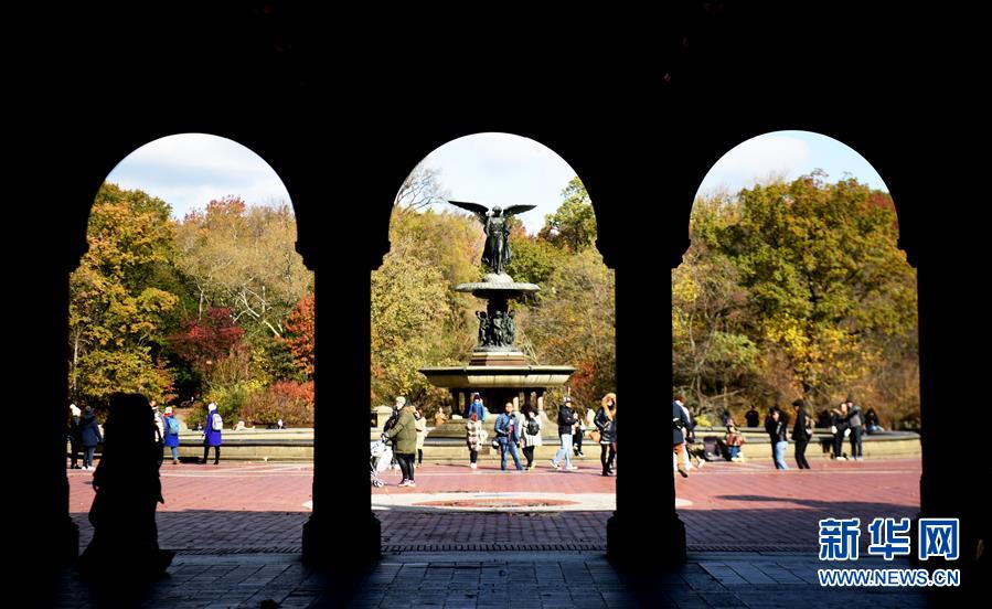 11月8日,游客在美国纽约中央公园贝塞斯达喷泉附近欣赏秋色。 11月上旬,随着气温骤降,纽约公园、街头等处树木变黄转红,整个城市沉浸在浓浓秋意之中。 新华社记者 韩芳 摄
