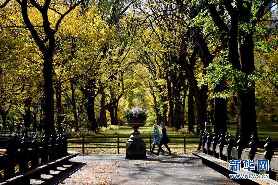 11月8日,游客漫步美国纽约中央公园。 11月上旬,随着气温骤降,纽约公园、街头等处树木变黄转红,整个城市沉浸在浓浓秋意之中。 新华社记者 韩芳 摄