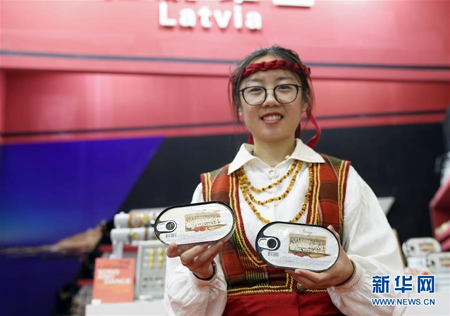 11月9日,工作人员展示来自拉脱维亚的鲱鱼罐头。 当日,中东欧进出口商品交易会在河北沧州举行,共有来自20余个国家和地区的300余种产品参展。 新华社记者 金良快 摄