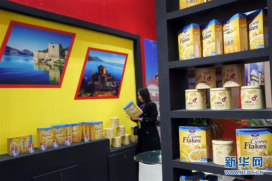 11月9日,参展商查看一款玉米片。 当日,中东欧进出口商品交易会在河北沧州举行,共有来自20余个国家和地区的300余种产品参展。 新华社记者 金良快 摄