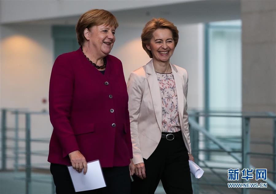 11月8日,在德国首都柏林的总理府,德国总理默克尔(左)和来访的欧盟委员会当选主席冯德莱恩抵达联合记者会现场。 德国总理默克尔8日与来访的欧盟委员会当选主席冯德莱恩出席联合记者会时表示,德国非常看重对参与5G网络建设的企业提出的安全要求及其可验证性,但不会为某个特定的供应商单独设定标准。 新华社记者单宇琦摄