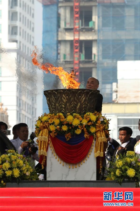 11月9日,在柬埔寨首都金边,柬埔寨国王西哈莫尼(前)在独立66周年庆祝活动上点燃火焰。