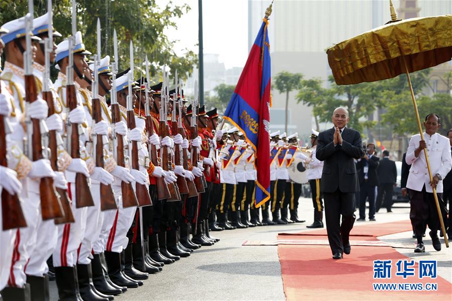 11月9日,在柬埔寨首都金边,柬埔寨国王西哈莫尼在独立66周年庆祝活动上检阅仪仗队。新华社发(索万纳拉摄)