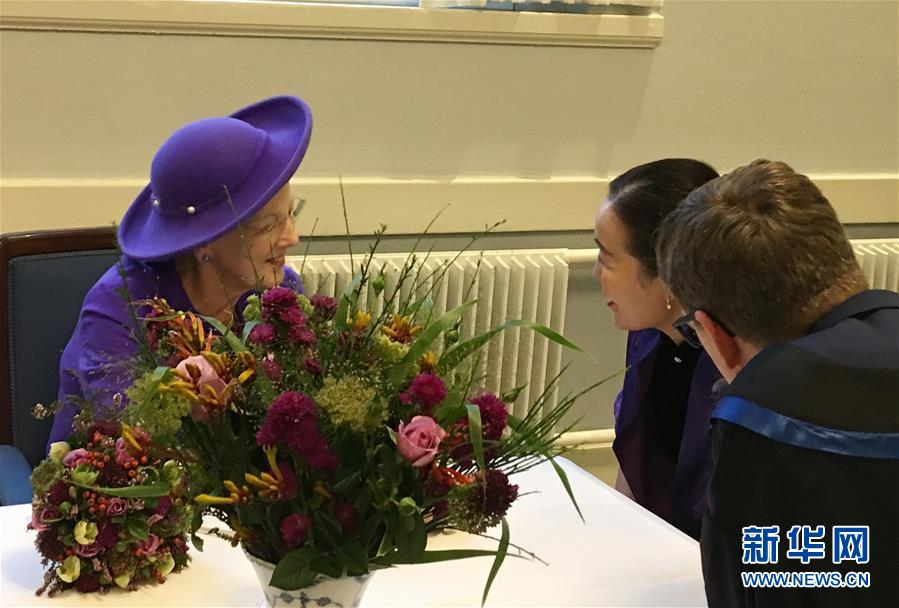 11月8日,在丹麦哥本哈根,丹麦女王玛格丽特二世(左)在哥本哈根大学建校庆典后与获颁荣誉博士学位的张喜华(中)交谈。新华社发(霍彬涛 摄)