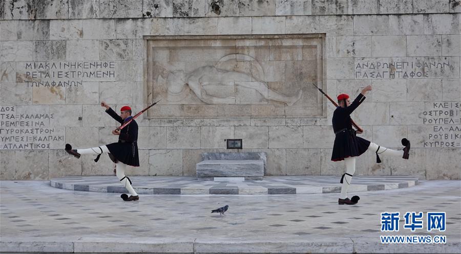 这是11月7日在希腊雅典宪法广场拍摄的士兵换岗仪式。新华社记者 赖向东 摄