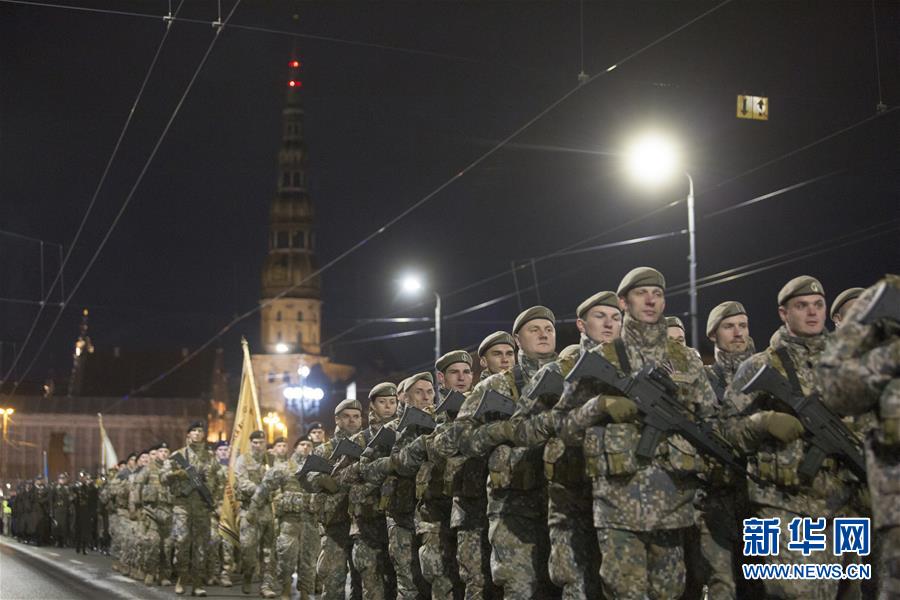 11月11日,在拉脱维亚首都里加,士兵参加阅兵式。 当日,拉脱维亚首都里加举行活动庆祝祖国保卫者日。1919年11月11日,拉脱维亚军队击退了入侵里加的贝尔蒙特军队,从而捍卫了国家独立。为纪念这一战役,拉政府将11月11日定为祖国保卫者日。 新华社发(埃迪斯·帕伦斯摄)