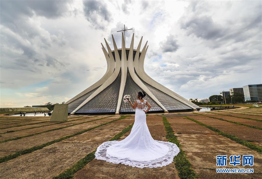 11月2日,一名新娘在巴西首都巴西利亚大教堂前拍摄婚纱照。新华社记者 兰红光 摄
