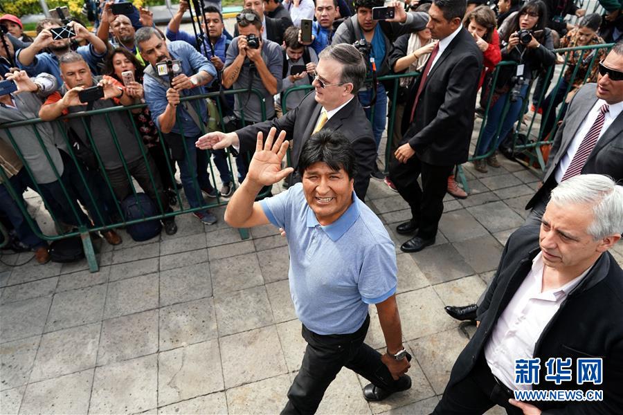 11月12日,在墨西哥首都墨西哥城,莫拉莱斯(中)抵达机场后挥手致意。 日前辞职的玻利维亚总统莫拉莱斯12日抵达墨西哥首都墨西哥城,接受墨方提供的政治庇护。 新华社发(戴维·德拉帕斯 摄)