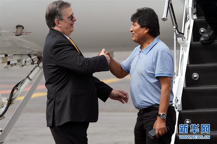 11月12日,在墨西哥首都墨西哥城,墨西哥外长埃布拉德(左)在机场迎接刚刚抵达的莫拉莱斯。 日前辞职的玻利维亚总统莫拉莱斯12日抵达墨西哥首都墨西哥城,接受墨方提供的政治庇护。 新华社发(戴维·德拉帕斯 摄)