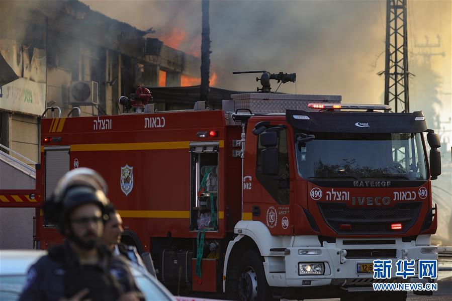 11月12日,在以色列斯代罗特,消防人员为一座遭火箭弹袭击后起火的工厂灭火。 为报复巴勒斯坦伊斯兰圣战组织(杰哈德)高级指挥官巴哈·阿布·阿塔12日早些时候被炸死,加沙地带武装组织当天向以色列发射近200枚火箭弹。 新华社/基尼图片社