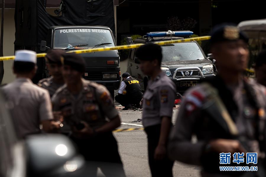 11月13日,在印度尼西亚棉兰市一个警察局,警察在自杀式爆炸袭击现场调查。 印尼北苏门答腊省首府棉兰一个警察局13日早遭遇自杀式爆炸袭击。据该省警察局发言人称,至少6人受伤,袭击者身份暂时不明。 新华社发(安德里·金廷 摄)