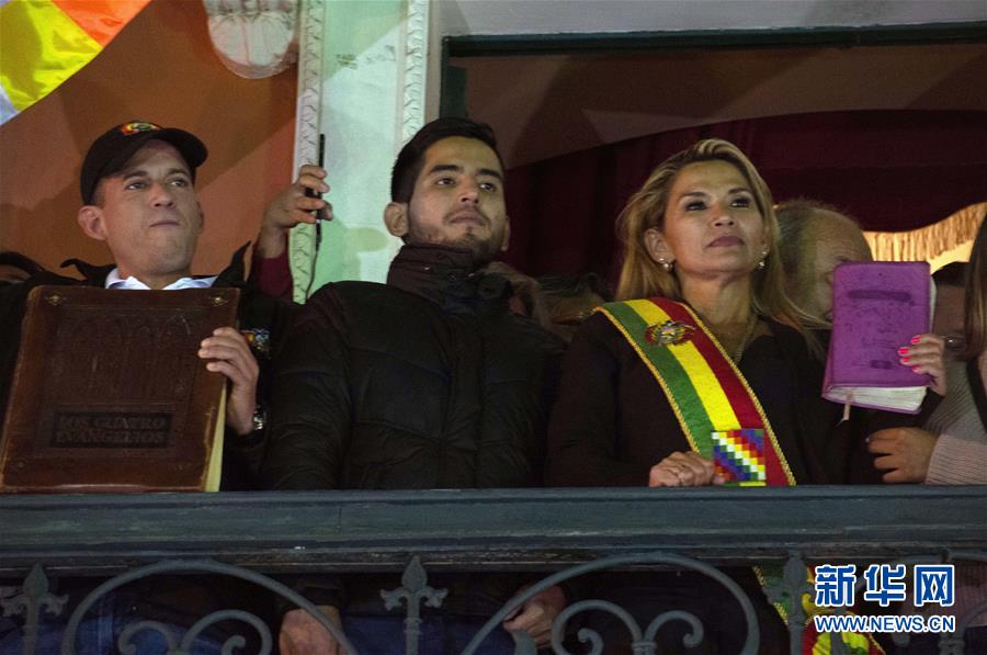 11月12日,在玻利维亚拉巴斯,珍尼娜·阿涅斯(右)宣布就任玻利维亚临时总统后戴上总统绶带。 新华社发(米根·汉考克 摄)