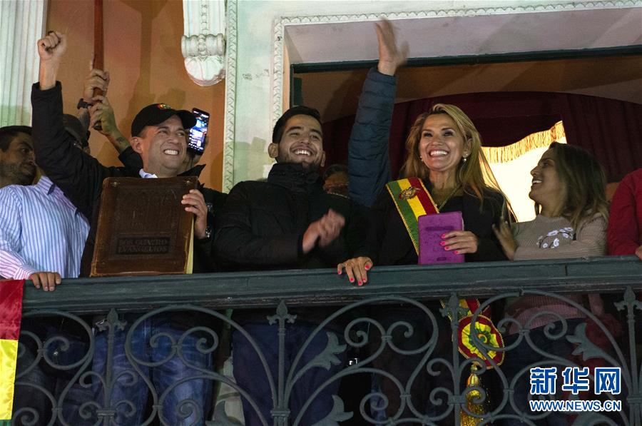 11月12日,在玻利维亚拉巴斯,珍尼娜·阿涅斯(右二)宣布就任玻利维亚临时总统后戴上总统绶带。 新华社发(米根·汉考克 摄)