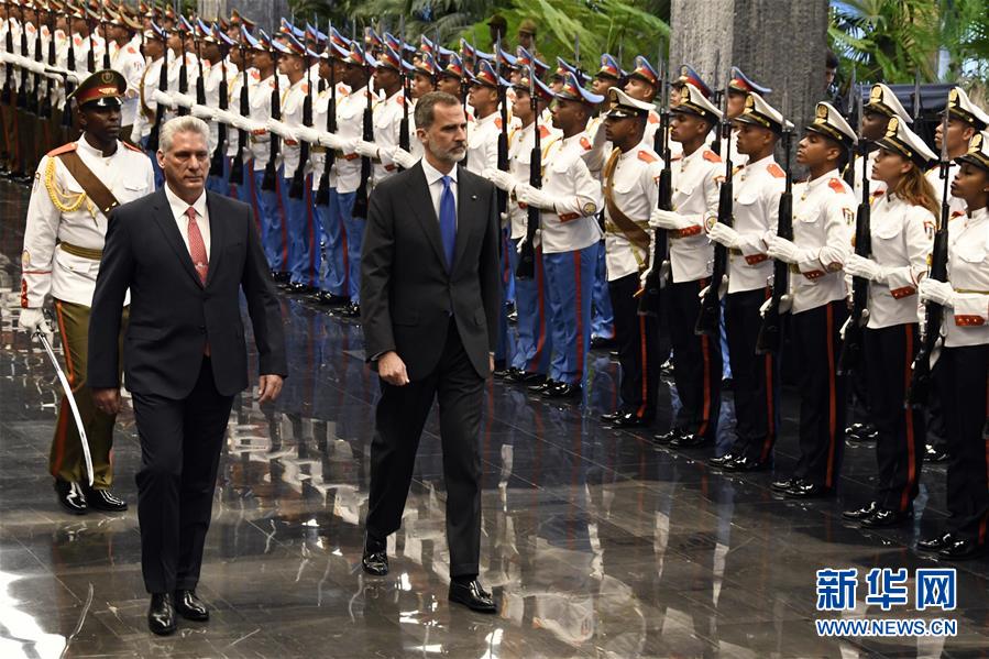 11月12日,在古巴首都哈瓦那,古巴国家主席迪亚斯-卡内尔(前左)与西班牙国王费利佩六世(前右)检阅仪仗队。 西班牙国王费利佩六世12日起开始对古巴进行为期3天的正式访问。他是历史上首位正式访问古巴的西班牙国王。 新华社发