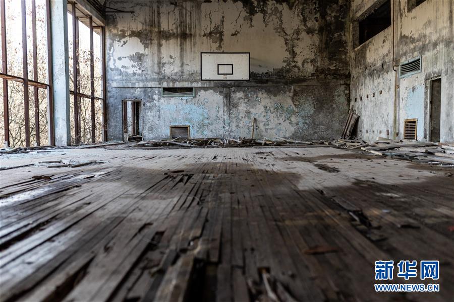 这是11月12日在乌克兰北部切尔诺贝利核电站附近的普里皮亚季城拍摄的废弃的篮球场。新华社记者 白雪骐 摄