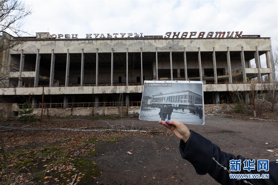 11月12日,在乌克兰北部切尔诺贝利核电站附近的普里皮亚季城,向导向记者展示一处建筑物在灾难发生前的照片。新华社记者 白雪骐 摄