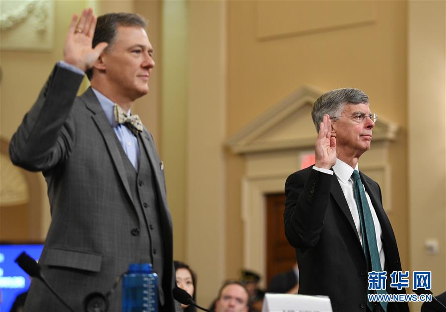 11月13日,在美国华盛顿,美国驻乌克兰临时代办泰勒(右)和美国负责欧洲和亚欧事务的助理国务卿帮办肯特出席听证会。新华社记者 刘杰 摄