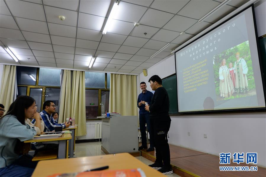 在内蒙古大学满洲里学院,维达力(右二)在给学生上课(11月13日摄)。 今年9月,“90后”俄罗斯小伙维达力成了内蒙古大学满洲里学院俄罗斯语言文学系的一名俄语教师,教授俄语语音课程,圆了他向往中国的梦。 维达力特别喜欢中国,“小时候我就对中国充满了兴趣,上大学的时候我主修东方历史专业。” 为了深入了解中国,2018年大学毕业后,他还特地到中国山东学习了10个月的汉语。 “我希望在中国生活工作的这段时间,能了解更多的中国文化,也希望能教授更多的俄语课程,让中国年轻人了解俄罗斯。”维达力说。 新华社记者 徐钦 摄