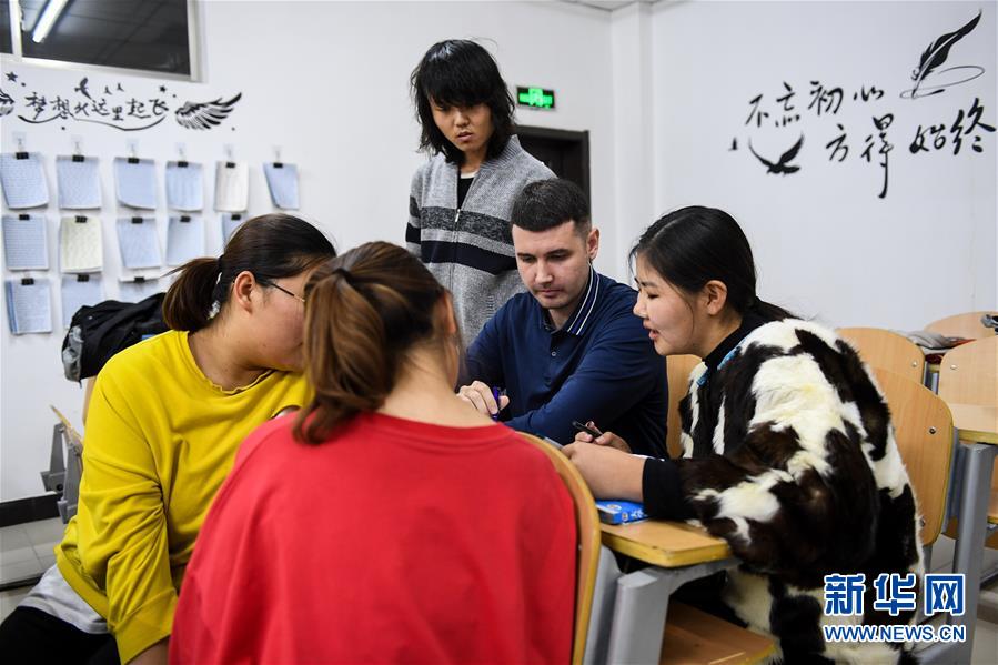 在内蒙古大学满洲里学院,维达力(右二)课后和学生交流(11月13日摄)。 今年9月,“90后”俄罗斯小伙维达力成了内蒙古大学满洲里学院俄罗斯语言文学系的一名俄语教师,教授俄语语音课程,圆了他向往中国的梦。 维达力特别喜欢中国,“小时候我就对中国充满了兴趣,上大学的时候我主修东方历史专业。” 为了深入了解中国,2018年大学毕业后,他还特地到中国山东学习了10个月的汉语。 “我希望在中国生活工作的这段时间,能了解更多的中国文化,也希望能教授更多的俄语课程,让中国年轻人了解俄罗斯。”维达力说。 新华社记者 刘磊 摄