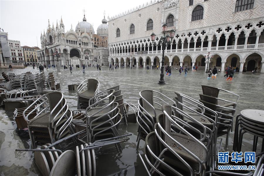 11月13日,在意大利威尼斯,人们走在洪水淹没的圣马可广场上。 受暴雨和潮汐影响,意大利“水城”威尼斯遭洪水侵袭,洪水最高水位达到187厘米,仅次于1966年创下的194厘米最高纪录。 新华社发(阿尔贝托·林格里亚 摄)
