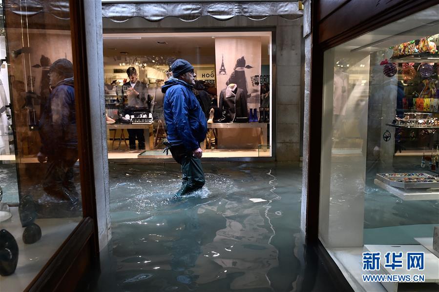 11月15日,在意大利威尼斯,一名男子涉水而行。 本周以来,受极端天气影响,威尼斯遭遇严重洪灾。 新华社发(阿尔贝托·林格里亚摄)