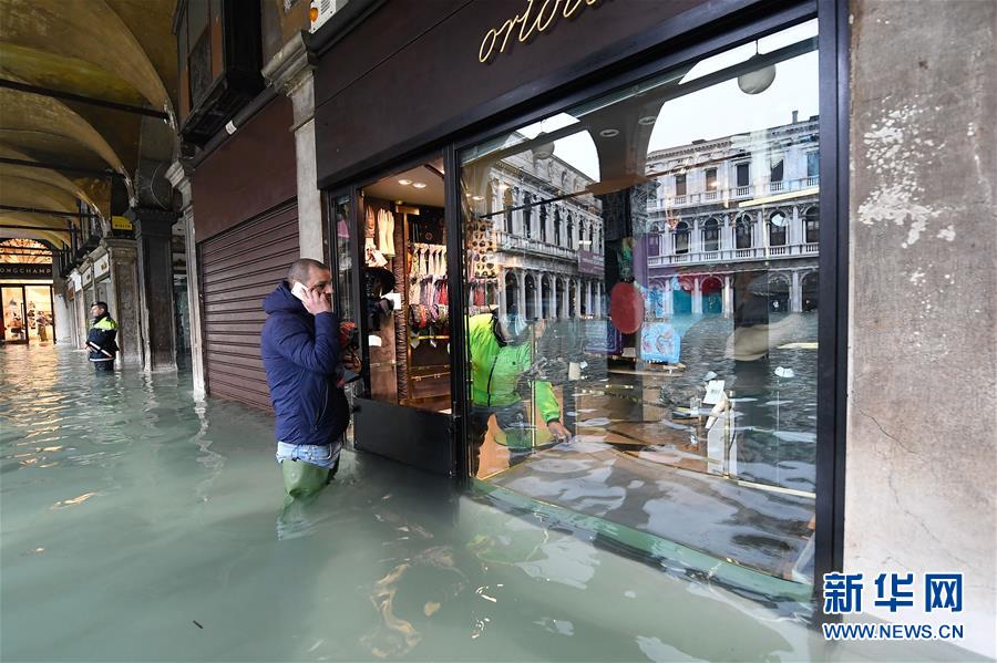 11月15日,在意大利威尼斯,一名男子站在洪水中打电话。 本周以来,受极端天气影响,威尼斯遭遇严重洪灾。 新华社发(阿尔贝托·林格里亚摄)