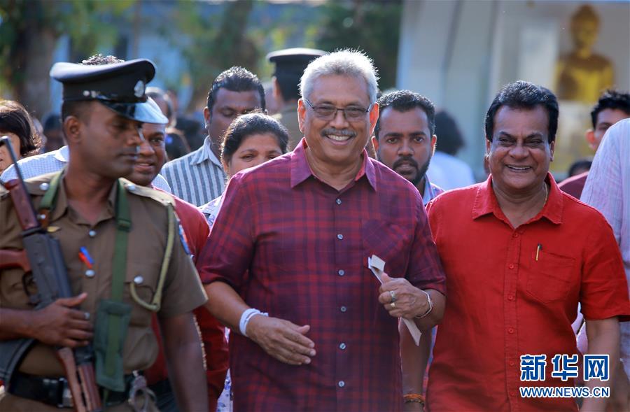 11月16日,在斯里兰卡首都科伦坡,主要反对党人民阵线党提名的总统候选人戈塔巴雅·拉贾帕克萨(中)投票后离开投票站。 当日,斯里兰卡举行总统选举。 新华社发