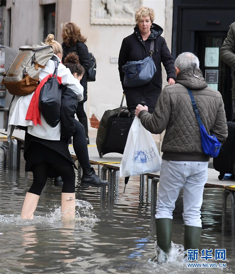 11月17日,在意大利威尼斯,人们涉水出行。 受极端天气影响,威尼斯近日遭遇严重洪灾。 新华社发(埃莉萨·林格里亚摄)