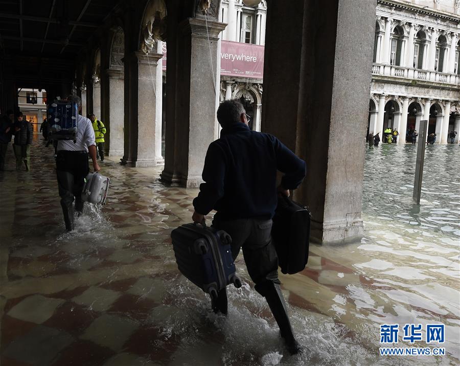 11月17日,在意大利威尼斯,人们涉水出行。 受极端天气影响,威尼斯近日遭遇严重洪灾。 新华社发(埃莉萨·林格里亚摄)